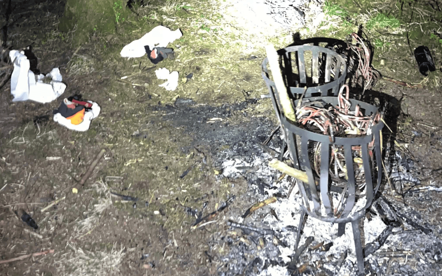 Sent en natt i april 2025 var polisen ute och patrullerade med bil i närheten av Metallvägen i Mölnlycke då de kände brandlukt. Ju närmre skogen i området de kom desto starkare blev lukten och när de kom nära såg de att det brann från två ställen. En man med pannlampa stod tillsammans med en kvinna och eldade koppardelar.