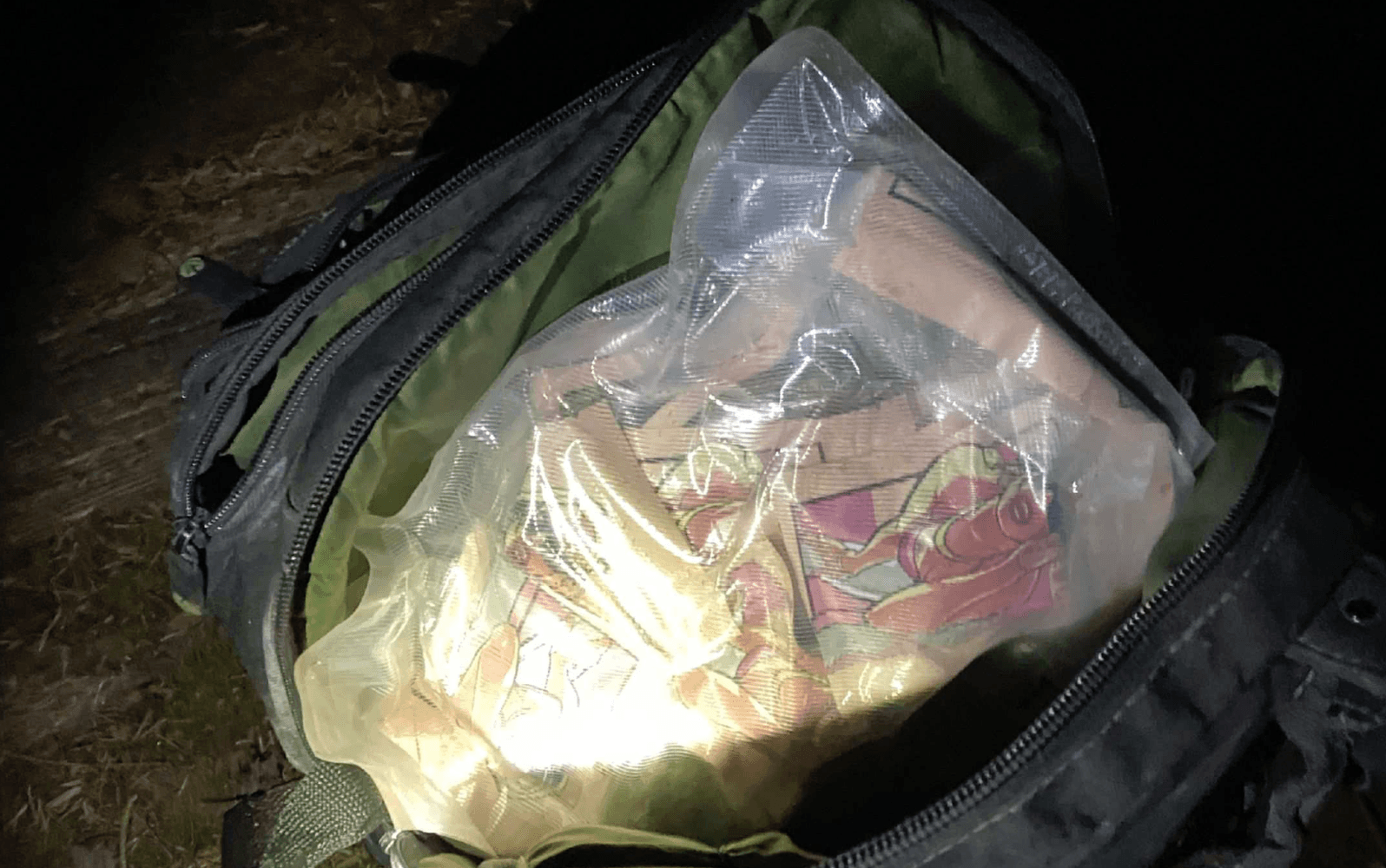 – Jag hittade det där, i en bergsskreva när jag uträttade mina behov. Så när jag sitter där så ser jag först … det går som en liten bro över där som vi var. Och så var det vid bergskammen där så hittade jag typ 50 meter in i skogen. Så hittade jag ett bra ställe att kunna sätta mig ned och uträtta mina behov om man säger så. Och när jag sitter där så ser jag en svart väska som är nedtryckt, en sådan där bag, sportbag. Och jag blir ju nyfiken och drar upp den och kollar och då ser jag att det är något som är gömt under mossa och grejer där och då hittar jag de här som ligger där om man säger så. De tre påsarna. Det kan man ju säkert se, ni har ju säkert bilder på det men det var ju alger och grejer så det hade ju legat där ett tag tror jag.