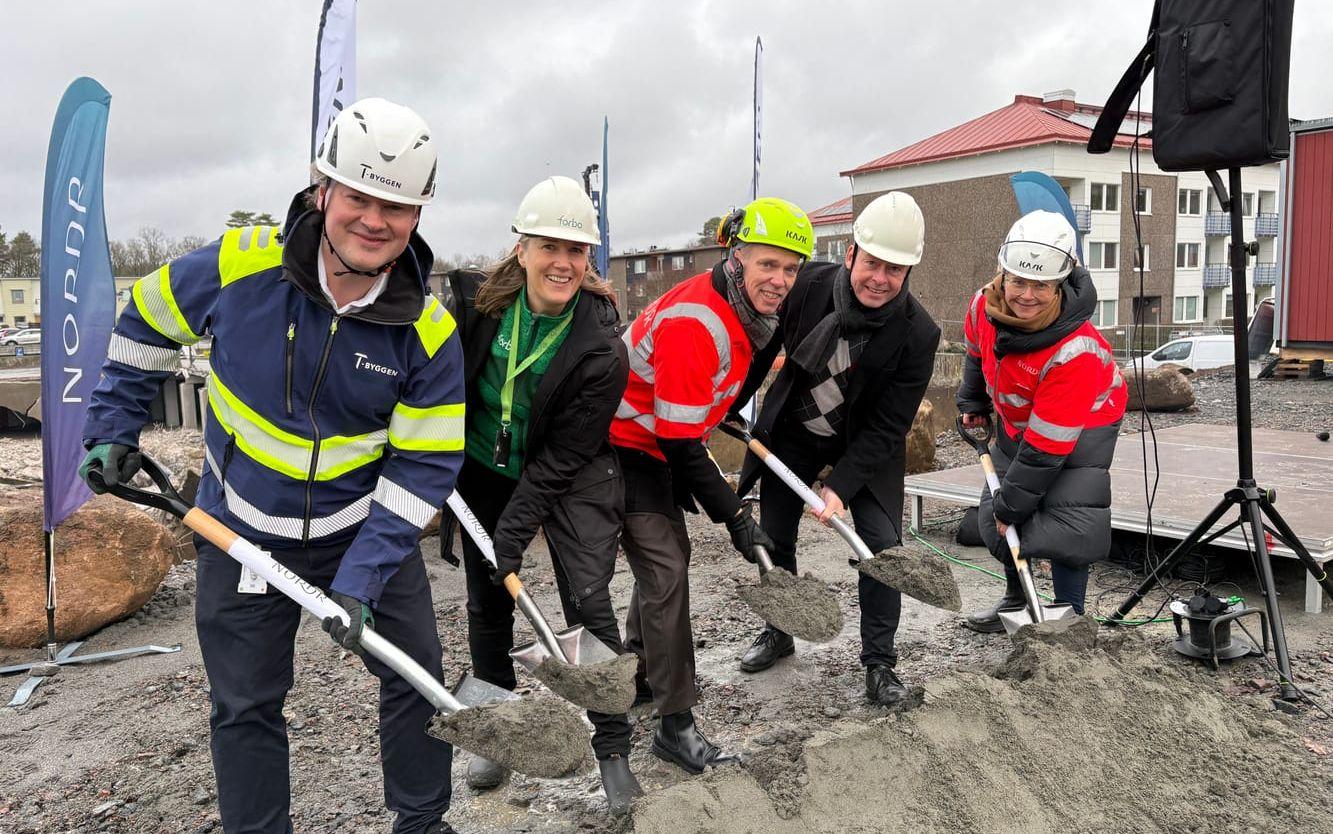 De står fem på rad framför tjusigt preppade grushögar, hugger i med varsin spade och tar det som kallas ”det första spadtaget” för det nya bostadsområdet Råda Höjder och dess första kvarter Platån.