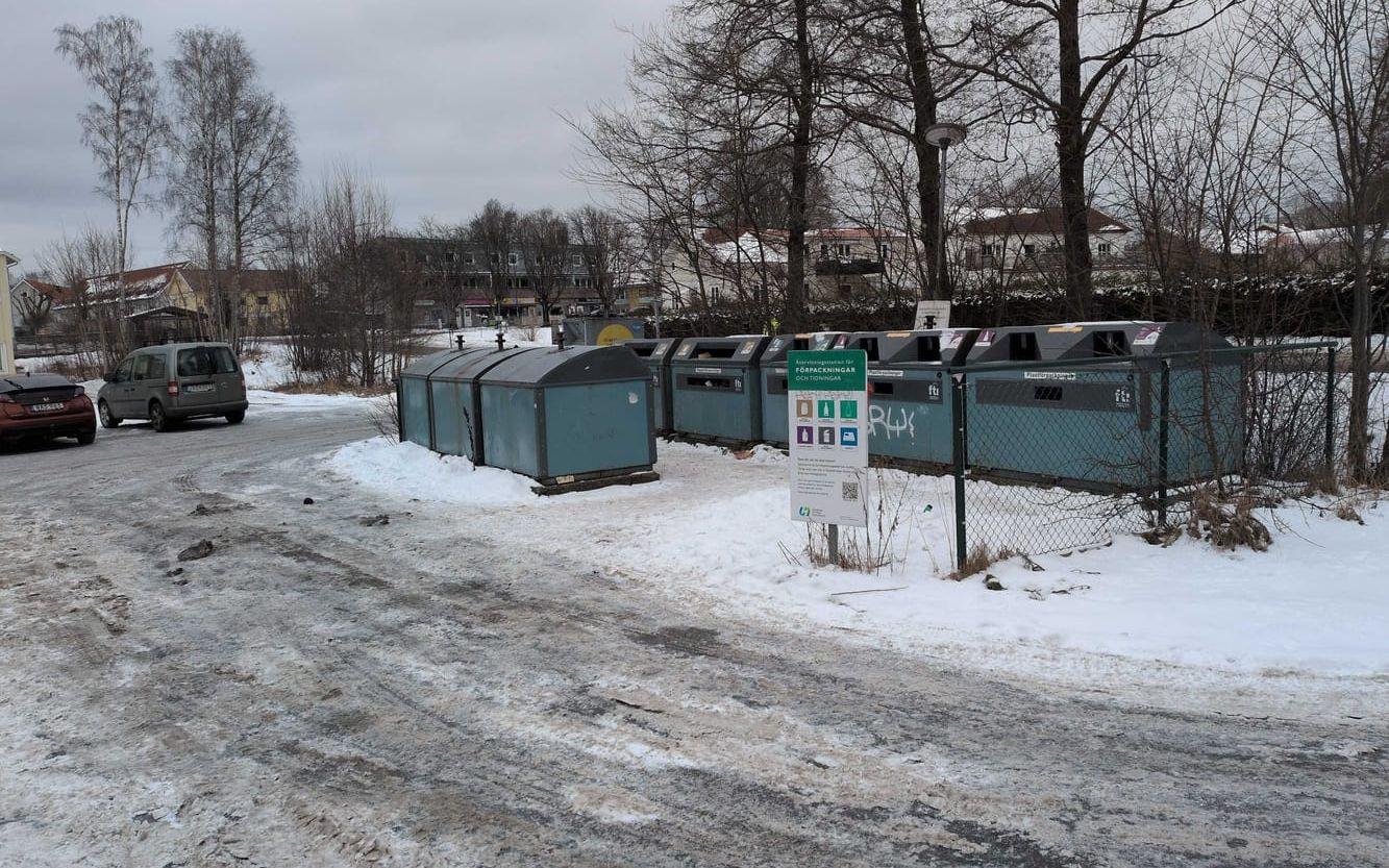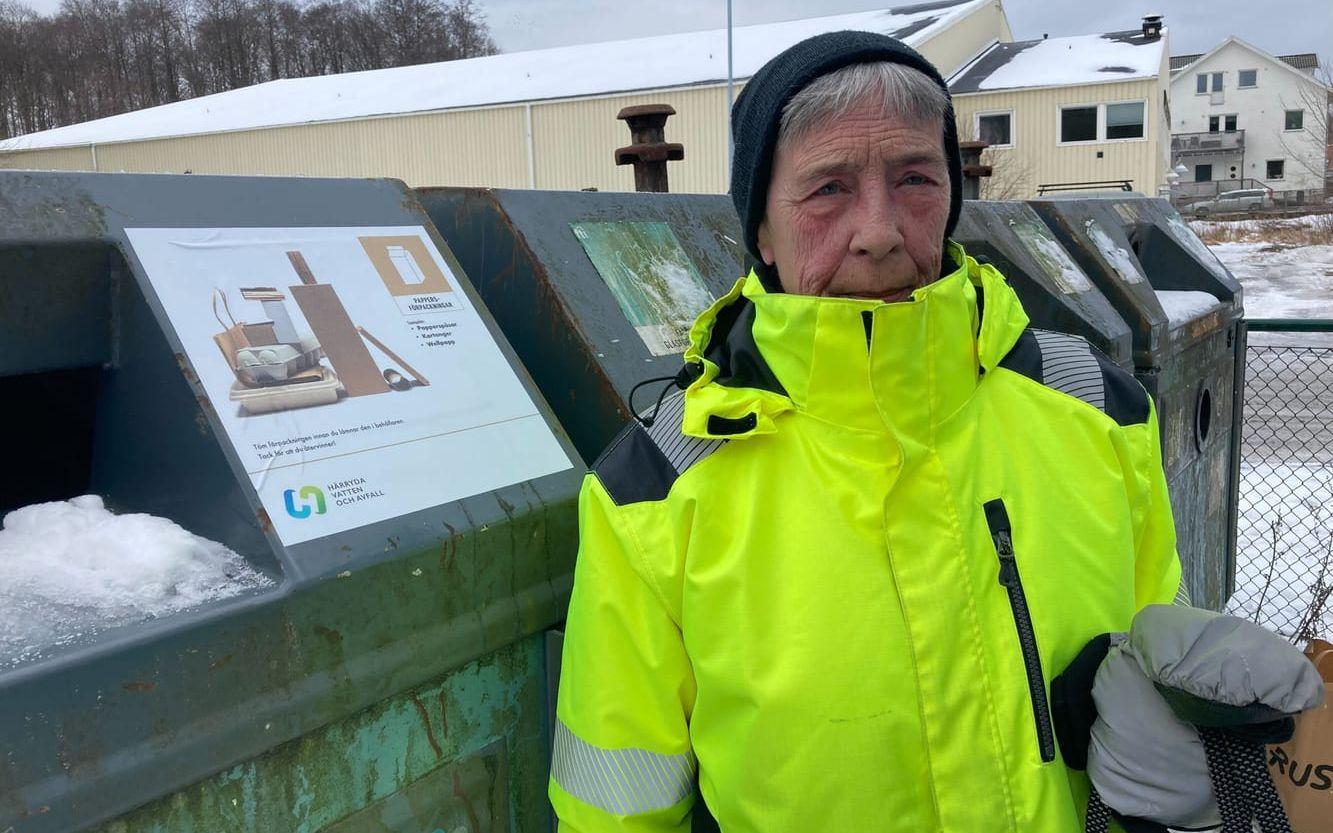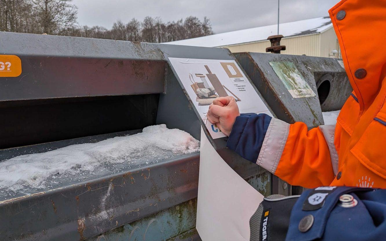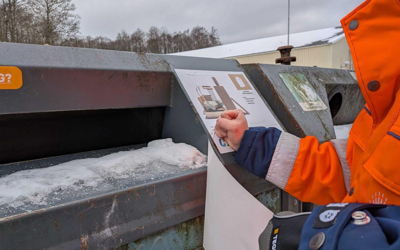 Eva Nygren, som bor i en bostadsrätt i området, har under torsdagsförmiddagen tagit sig till återvinningsstationen på Kyrkvägen i Landvetter för att slänga skräp. När hon kommer dit har behållarna precis fått sina nya skyltar.